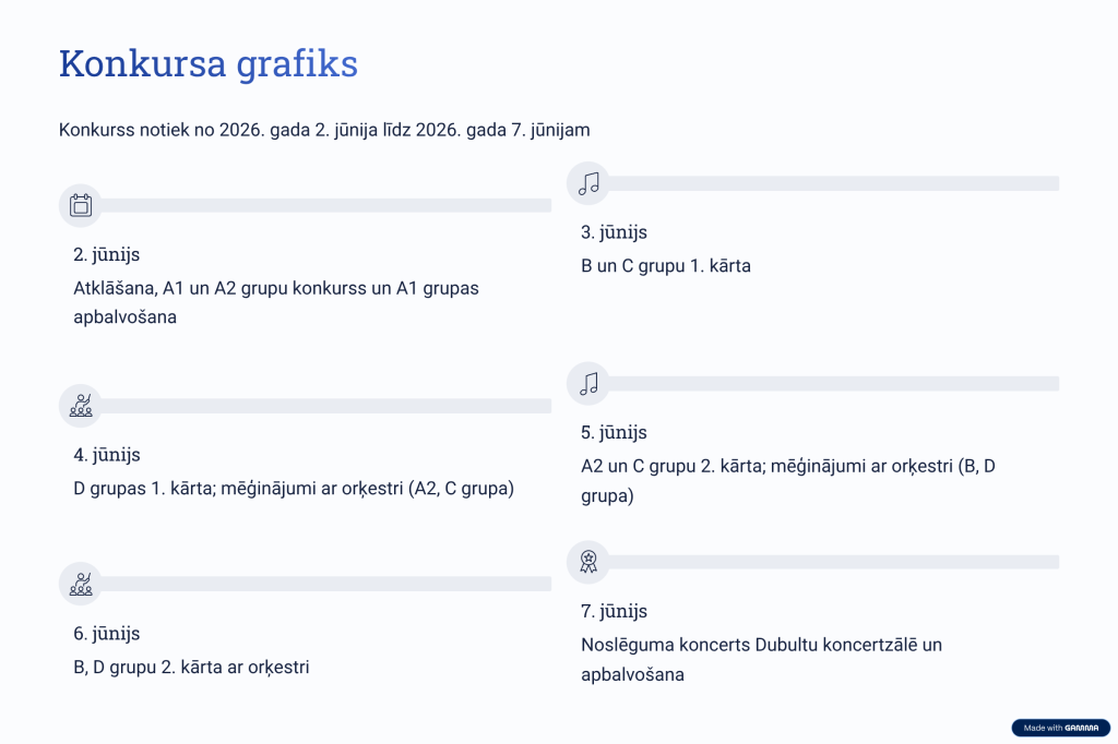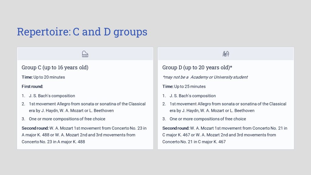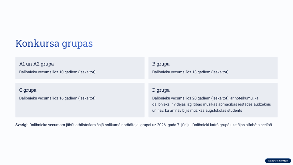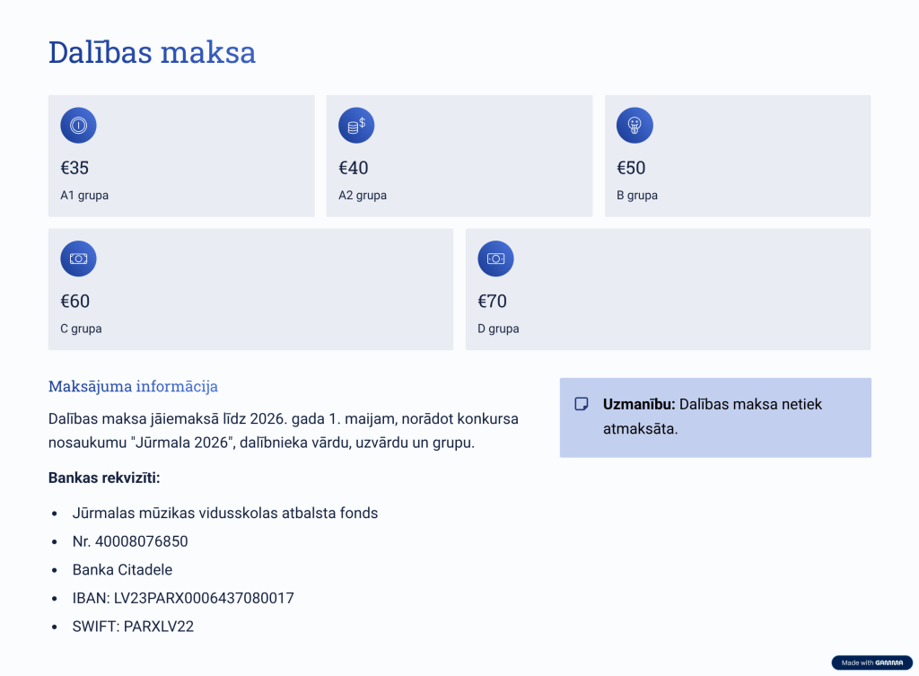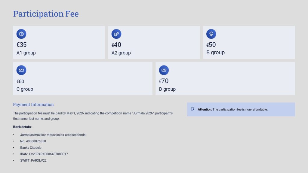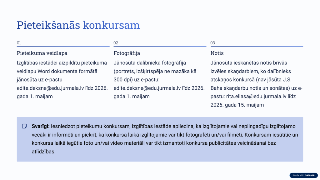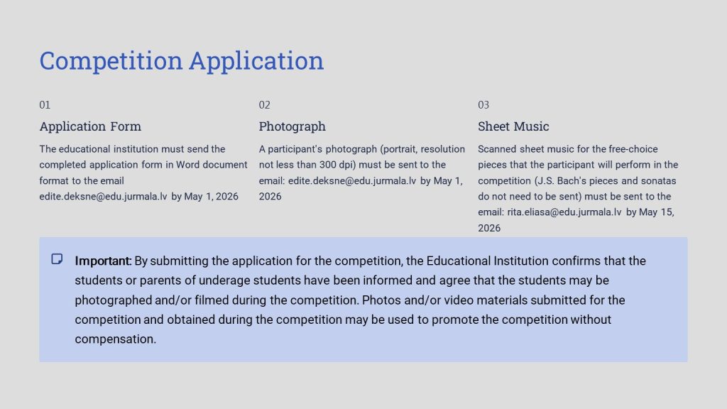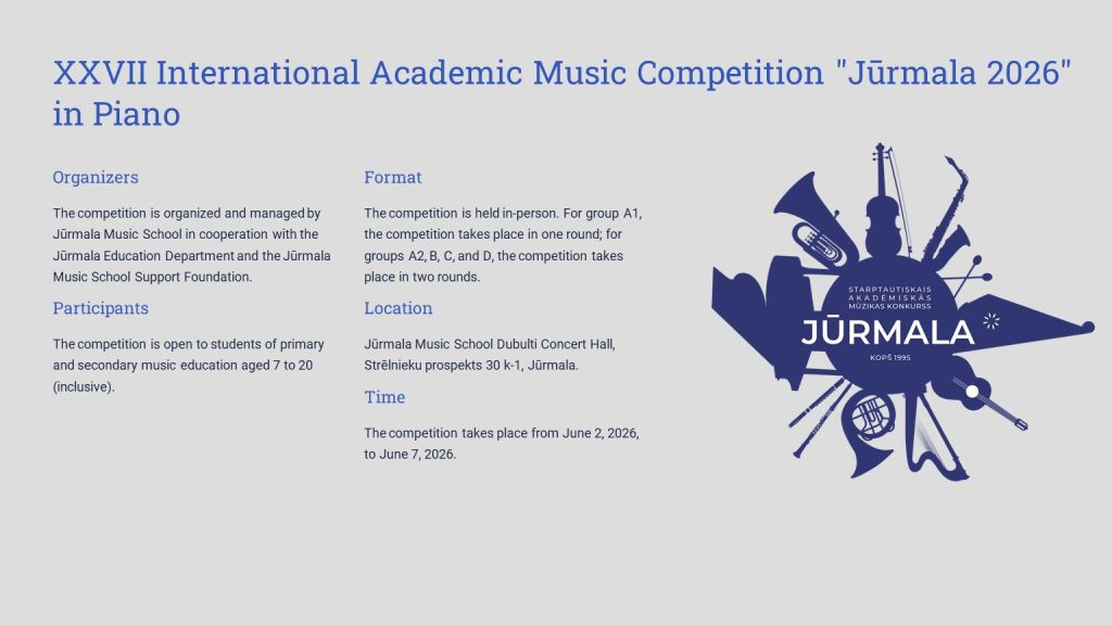 XXVII konkurss / Competition "Jūrmala 2026" klavierspēlē / piano XXVII Starptautiskais akadēmiskās mūzikas konkurss "Jūrmala" klavierspēlēInternational Academic Music Competition “Jurmala 2026” in Piano Performance Pieteikšanās anketa / application form Nolikums Word.doc. Nolikums pdf Regulations english
